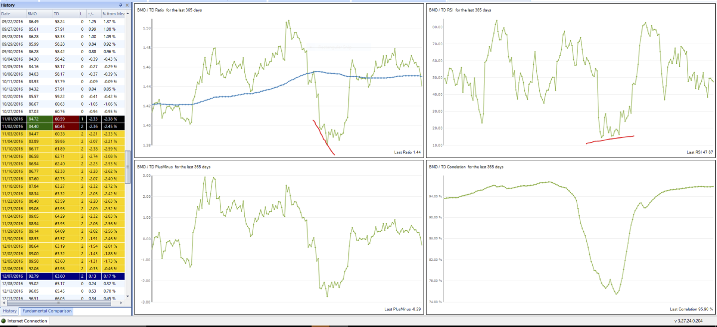 What is clear is that the BMO/TD Price Ratio is still declining rapidly, yet the RSI is starting to increase. This situation is shown by a downward sloping red line on the Price Ratio chart vs. an upward sloping red line on the RSI chart. This situation is called divergence, and often signals an imminent turnaround in the price action. Coupled with the extreme reading on the RSI (<20) and the >-2.5sd on the +/- chart, chances are this setup is a good trade to take based on technical analysis (still need to review news and fundamentals).
