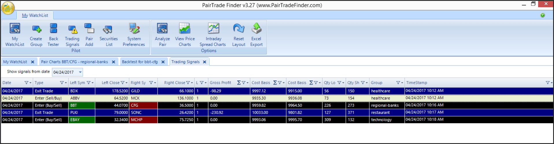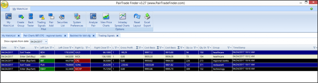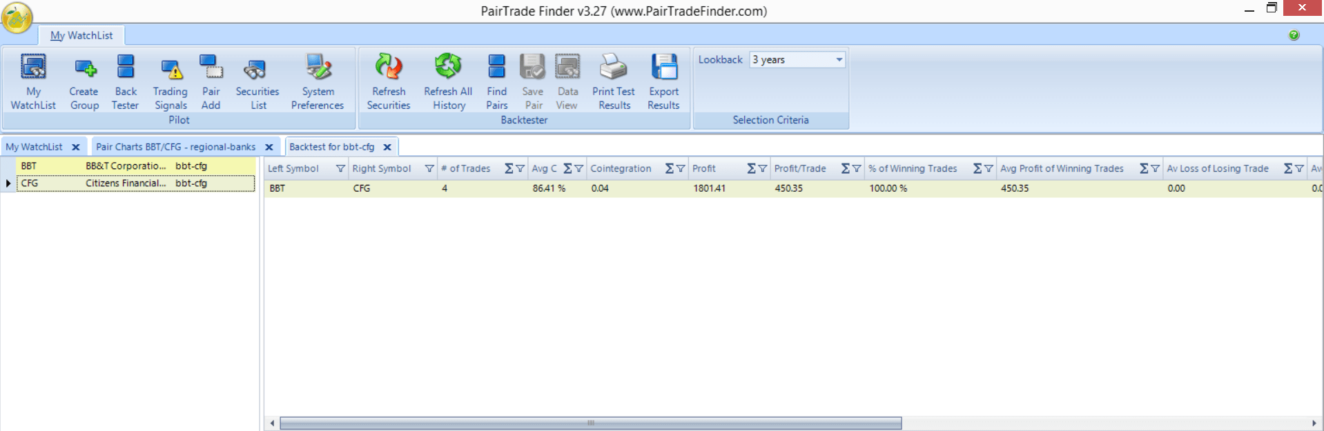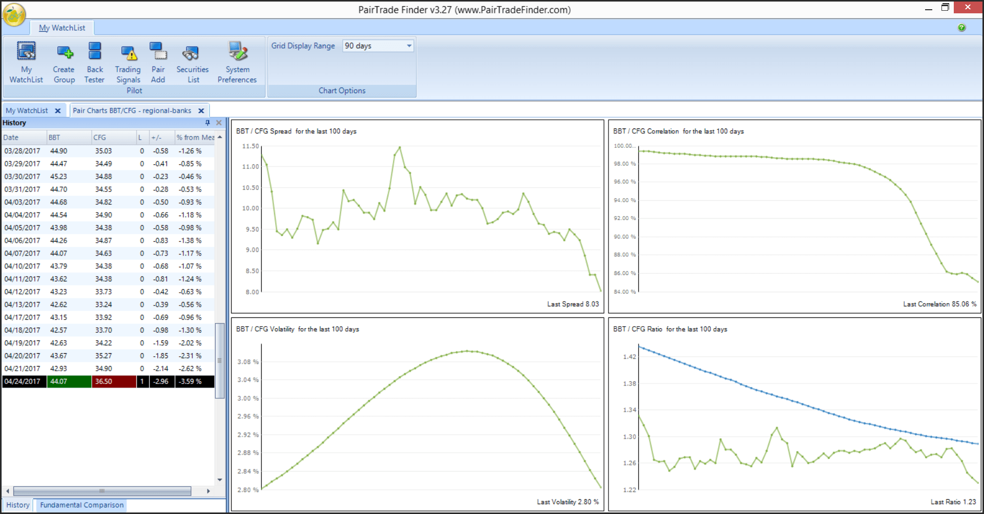 The trading signal section will describe the number of shares that need to be transacted if you use $10K on each side of the trade. You would need to purchase 226 shares of BBT at approximately $44.07 and short sell 371 shares of CFG at approximately $36.50. The ratio is approximately 1.23.
