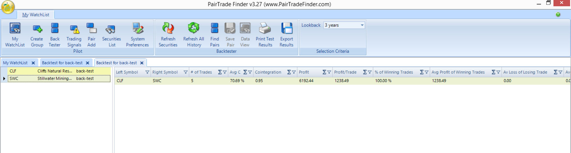 The backtest of the two stocks shows that over the past 3-years 5-signals were generated with a stretchof 2.7 standard deviations for an entry criteria, and a take profit or stop losswhen the ratio (the price of CLF/SWC) reverted back to 1-standard deviation below the 100-day moving average. The results were extremely impressive. The pair has a winning percentage of 100%. The profit per trade is slightly more than $1,238. The overall profit on the strategy over the 3-year period is $6,1920, and the average cointegration of the returns of the two shares is approximately 95%.