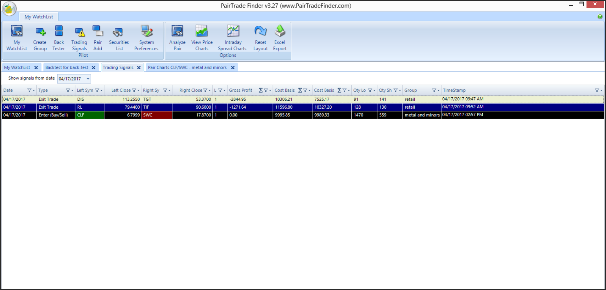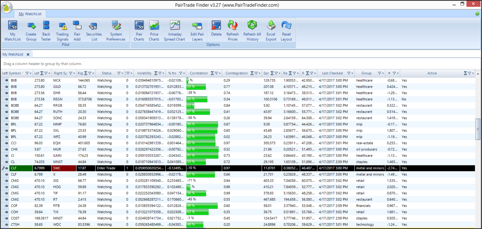 The Pairtrade Finder analytic generated a signal to purchase Cliffs Natural Resources and Sell/short Still Water Mining Co. Both companies are in the mining and natural resources space. Infrastructure stocks, which include CLF are under pressure, as traders are concerned about the viability of Trumps legislative plans. CLF is scheduled to release earnings which are on April 27 and Still Water is schedule to provide financial results on May 5th, 2017. The is no stock specific news that is driving the pair lower.