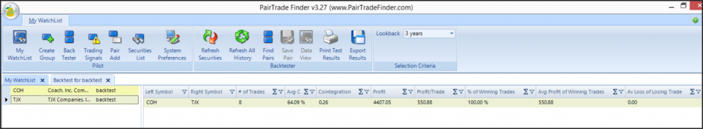 The backtest of the two stocks shows that over the past 3-years 8-signals were generated with a stretch of 2.7 standard deviations for an entry criteria, and a take profit or stop loss when the ratio (the price of COH / TJX) reverted back to 1-standard deviation below the 100-day moving average.