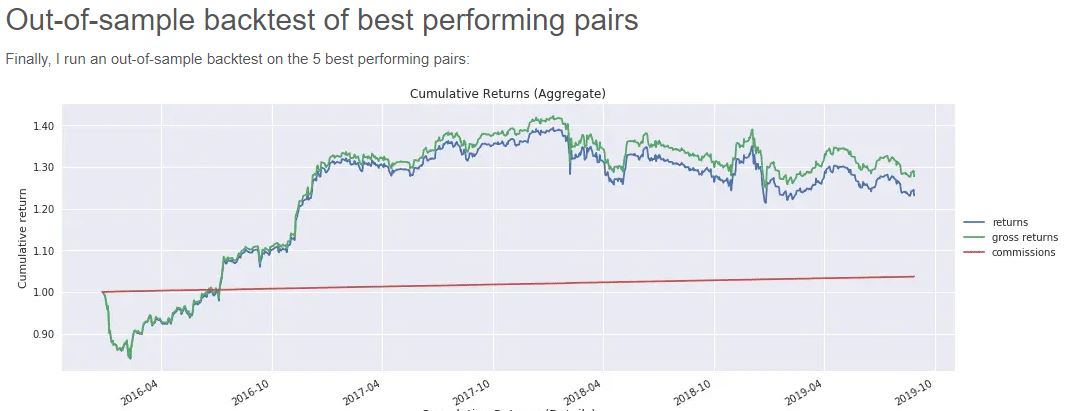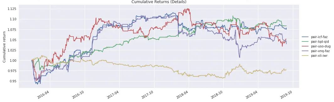 A study undertaken by QuantRocket examines the historical out-of-sample/live returns available from pairs of popular and highly-liquid USA ETFs. They boiled the ocean and performed a cointegration test on over 6,000 pairs formed from the 110 ETFs that had over $10 million/day of daily traded volume. They then chose the top five performers and ran them out-of-sample for about four years. Here are the results: