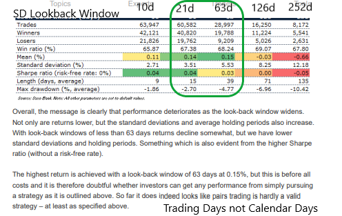 In it you will see that about 1.5 month lookback (33 trading days) leads to the highest return and highest Sharpe Ratio combination. It strikes the balance between number of trades per year on a pair and the best Reward/Risk trade-off.