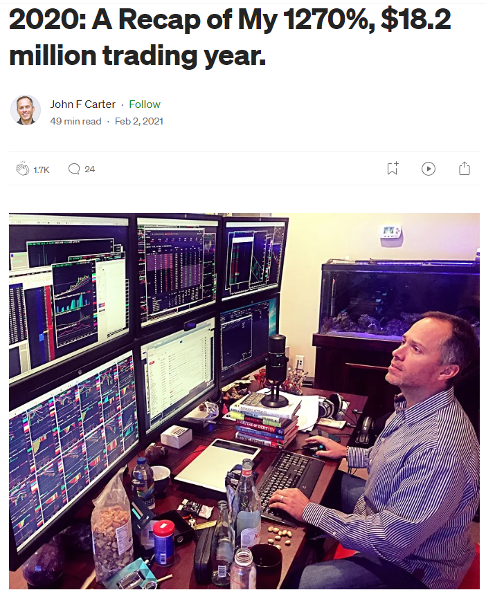 It is the story of John Carter’s 2020 trading year, as told by him in his journal and in an unbelievable article he wrote in 2021. He turned a $1.4m trading account into $19.6m in 12 months. 1270% return. How’s that for inspiration?