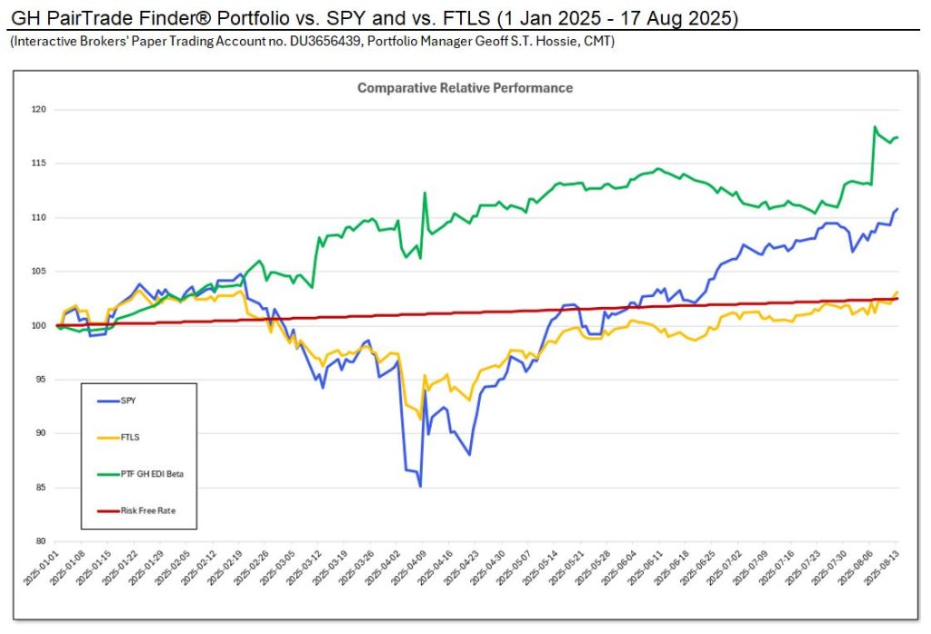 All trades are executed in a synthetic Interactive Brokers paper‑trading account (DU3656439), overseen by Portfolio Manager Geoff S.T. Hossie, CMT. The account traded over the period 1 Jan 2025 – 13 Aug 2025 (the date of closing). The engine generated ≈ 431 closed statistical-arbitrage trades across the monitored pairs. Each position is sized to a maximum 1.5% risk of the account equity. This discipline helps ensure no single trade can materially erode capital. The only stop loss applied is a time stop of 50 days in trade. Pairs that developed high volatility Ratios were excluded over time.